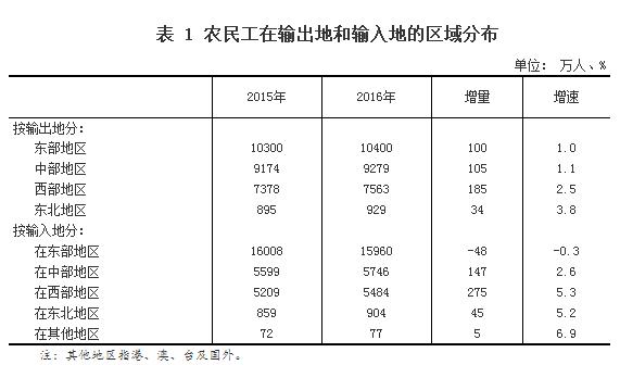 从输入地看,在东部地区务工农民工15960万人,比上年减少48万人,下降0.3%,占农民工总量的56.7%;在中部地区务工农民工5746万人,比上年增加147万人,增长2.6%,占农民工总量的20.4%;在西部地区务工农民工5484万人,比上年增加275万人,增长5.3%,占农民工总量的19.5%;在东北地区务工农民工904万人,比上年增加45万人,增长5.2%,占农民工总量的3.2%。