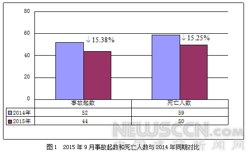 2015年9月,全国共发生房屋市政工程生产安全事故44起、死亡50人,比去年同期事故起数减少8起、死亡人数减少9人,同比分别下降15.38%和15.25%(见图1)。
