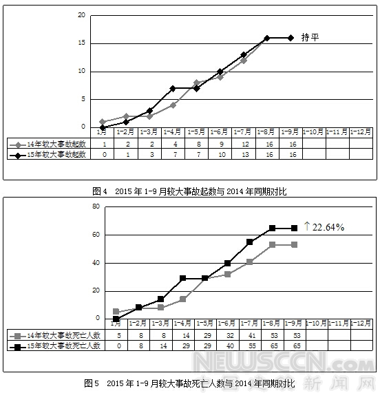 2015年1-9月,全国共发生房屋市政工程生产安全较大事故16起、死亡65人,与去年同期相比事故起数持平,死亡人数增加12人,同比上升22.64%(见图4、图5)。