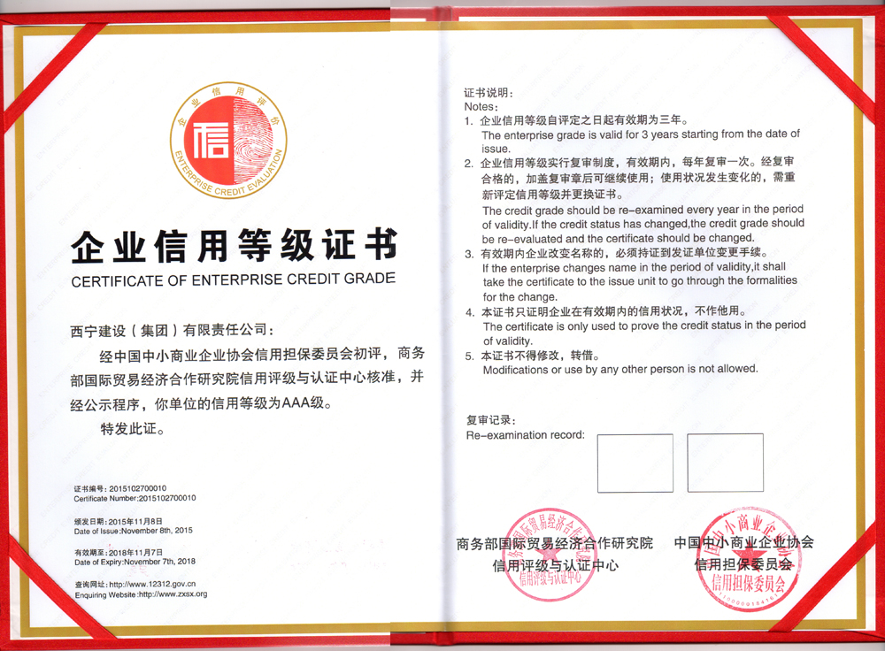 近日,通过对西宁建设(集团)有限责任公司履约能力和履约意愿的综合评价,被评为AAA级信用企业。取得此项殊荣,为该公司在市场化经营奠定了良好基础。