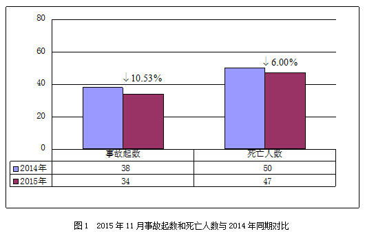 2015年11月,全国共发生房屋市政工程生产安全事故34起、死亡47人,比去年同期事故起数减少4起、死亡人数减少3人,同比分别下降10.53%和6.00%(见图1)。