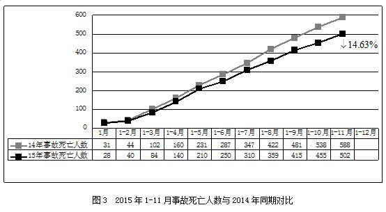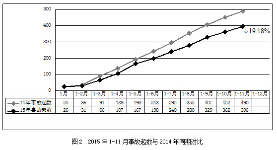 2015年1-11月,全国共发生房屋市政工程生产安全事故396起、死亡502人,比去年同期事故起数减少94起、死亡人数减少86人,同比分别下降19.18%和14.63%(见图2、图3)。