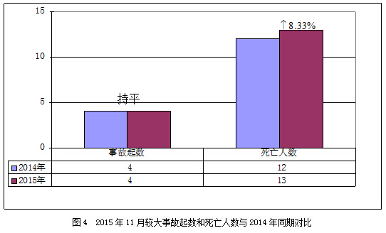 2015年11月,全国共发生房屋市政工程生产安全较大事故4起、死亡13人,与去年同期事故起数持平,死亡人数增加1人,同比上升8.33%(见图4)。