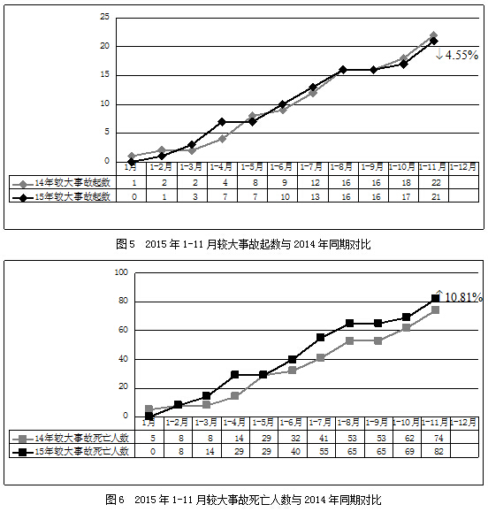 2015年1-11月,全国共发生房屋市政工程生产安全较大事故21起、死亡82人,比去年同期事故起数减少1起,死亡人数增加8人,同比分别下降4.55%和上升10.81%(见图5、图6)。