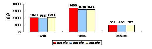 2015年,行业完成总营业收入3148亿元,同比降低1.84%。水电施工企业2015年总营业收入1611亿元,同比持平;火电施工企业2015年总营业收入1034亿元,同比增长4.87%;送变电施工企业2015年总营业收入503亿元,同比增长1.62%。