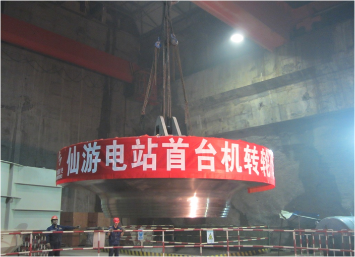 >>主要设备 采用我国首台自主创新、自主研制的500m水头段300MW级高水头大容量抽水蓄能机组,应用我国自主研发、制造、安装的单根超千米的500kV电缆及终端。(右图:抽水蓄能机组转轮吊装)
