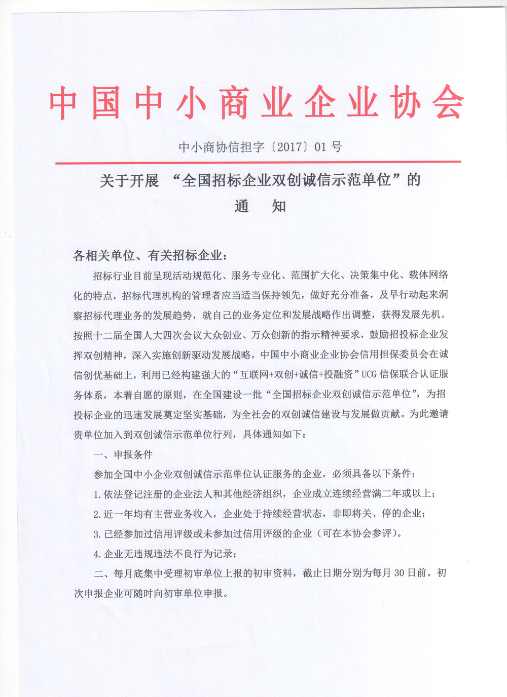 关于开展 “全国招标企业双创诚信示范单位”的通知