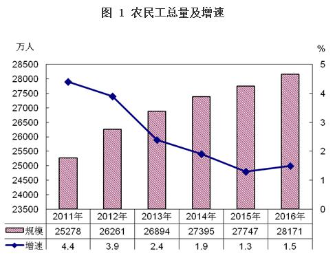 日前,国家统计局发布2016年农民工监测调查报告。2016年农民工总量达到28171万人,比上年增加424万人,增长1.5%,增速比上年加快0.2个百分点。