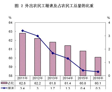 2011-2016年,外出农民工增速呈逐年回落趋势,增速分别为3.4%、3%、1.7%、1.3%、0.4%和0.3%。外出农民工占农民工总量的比重也由2011年的62.8%逐渐下降到2016年的60.1%。