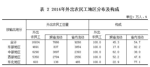 从输出地看,东部地区农民工10400万人,比上年增加100万人,增长1%,占农民工总量的36.9%;中部地区农民工9279万人,比上年增加105万人,增长1.1%,占农民工总量的32.9%;西部地区农民工7563万人,比上年增加185万人,增长2.5%,占农民工总量的26.9%;东北地区农民工929万人,比上年增加34万人,增长3.8%,占农民工总量的3.3%。西部地区农民工人数增长快于其他地区,西部地区农民工增量占新增农民工的43.6%。