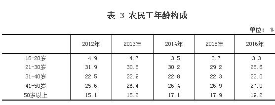 农民工仍以青壮年为主,但所占比重继续下降,农民工平均年龄不断提高。从平均年龄看,2016年农民工平均年龄为39岁,比上年提高0.4岁。从年龄结构看,40岁以下农民工所占比重为53.9%,比上年下降1.3个百分点;50岁以上农民工所占比重为19.2%,比上年提高1.3个百分点。