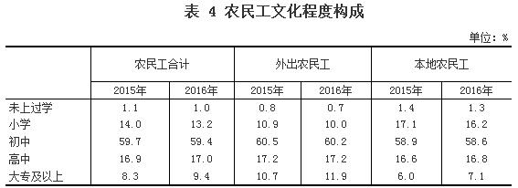 农民工中,未上过学的占1%,小学文化程度占13.2%,初中文化程度占59.4%,高中文化程度占17%,大专及以上占9.4%。高中及以上文化程度农民工所占比重比上年提高1.2个百分点。其中,外出农民工中高中及以上文化程度的占29.1%,比上年提高1.2个百分点;本地农民工中高中及以上文化程度的占23.9%,比上年提高1.3个百分点。