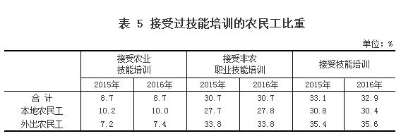 接受过农业和非农职业技能培训的农民工占32.9%,比上年下降0.2个百分点。其中,接受非农职业技能培训的占30.7%,接受过农业技能培训的占8.7%,均与上年持平;农业和非农职业技能培训都参加过的占6.5%,比上年提高0.2个百分点。其中,本地农民工接受过农业和非农职业技能培训的占30.4%,比上年下降0.4个百分点;外出农民工接受过农业和非农职业技能培训的占35.6%,比上年提高0.2个百分点。