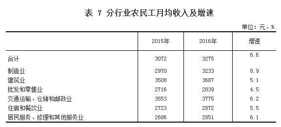 农民工月均收入3275元,比上年增加203元,增长6.6%,增速比上年回落0.6个百分点。分行业看,建筑业农民工月均收入增速比上年回落1.5百分点。