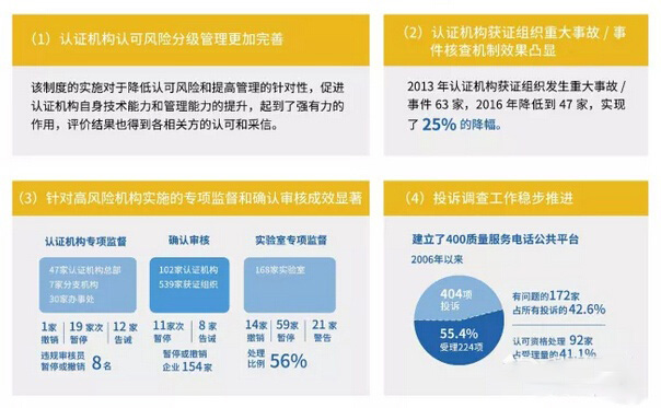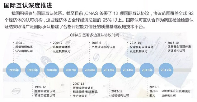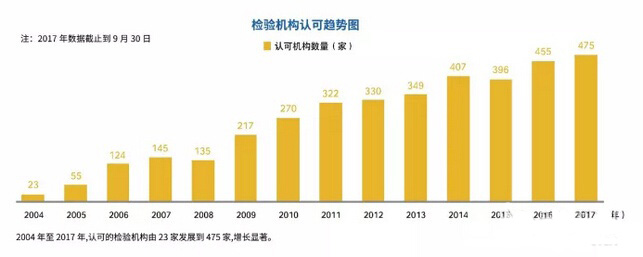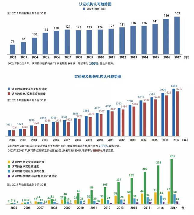 截止到2017年9月30日,认可的认证机构有163家,认可实验室及相关机构8642家,认可的检测机构和校准实验室有8210家。其中医学实验室认可速度最快,达281家;认可的生物安全实验室达77家。